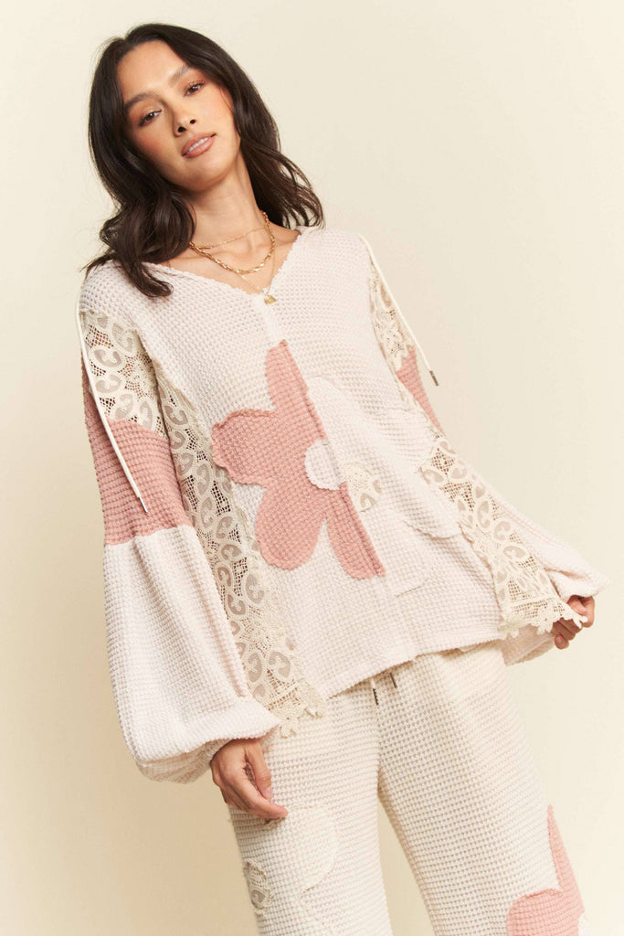 Add a playful edge to casual looks with this floral lace patch hoodie. Designed in a waffle knit with crochet lace panels, it features oversized flower appliques and relaxed balloon sleeves for a boho-chic feel. The drawstring hood and soft texture make it a cozy yet standout layer, perfect for boutique collections seeking unique, detail-driven pieces that blend comfort with charm. Matching bottom separate.  97% poly 3% spandex