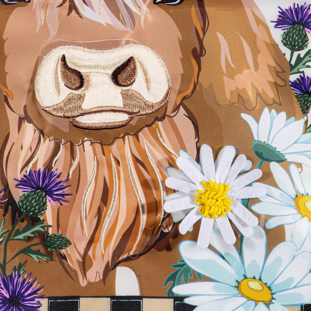This charming flag adds an extra special touch to any home. It features an adorable highland cow surrounded by flowers. Each Evergreen applique flag is carefully crafted from multiple layers of 310 denier nylon made from recycled plastic that can withstand a variety of weather conditions. We combine pieces of fade-resistant, strong fabric with tight, detailed stitching to create a dimensional mosaic effect. The soft yet heavyweight material illuminates beautifully in sunlight. Each flag features a sleeve that fits standard flagpoles or stands, sold separately. Due to the nature of the packaging, wrinkling may have occurred. Once item is unfolded and mounted on hardware, the creases will naturally fall out. Spot clean only. Never put in a dryer. When not in use, flags can be hung in a closet or placed in a storage container. 12.5” x 18” garden.