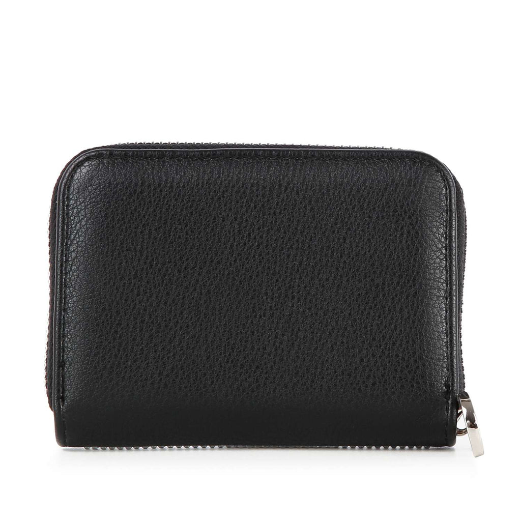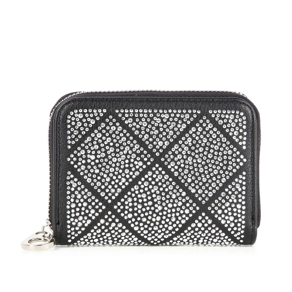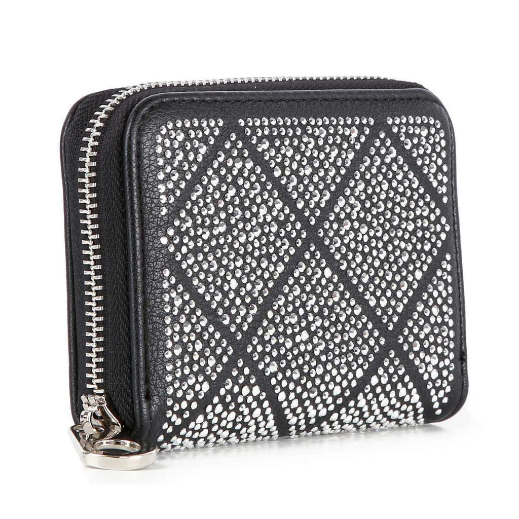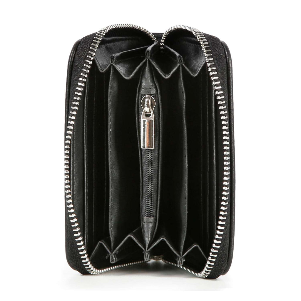 Accordion wallet with zip-around closure. Interior zip divider pocket, multiple currency slots and card slots. Black Faux leather construction. Silver hardware. Approximate Size: 4.75L x 3.75H x 1W