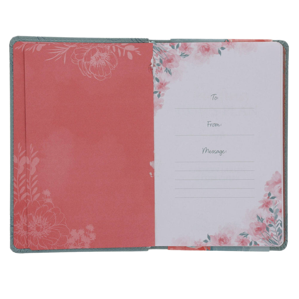 In the Trusting in God's Plan Teal Faux Leather 90-Day Devotional, you will discover how God moves mightily to fulfill His purpose. Authors Carolyn Larsen and Cori Cheek illustrate through 90 devotions that God's plans cannot be thwarted.  Heat-debossed floral cover design Gold-foiled accents Teal faux leather  Heat-debossed and gold-foiled title Flexcover  Two-color interior  Satin ribbon marker  188 gilt-edged pages  90 devotions  Size: 7.2" x 4.8" x 0.4" (183 x 122 x 10mm)