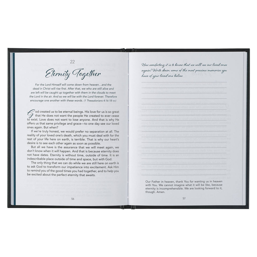 Begin a journey of healing as you meditate on the devotions of the Losing a Loved One Black Hardcover Devotional. This devotional will nurture your soul, and its thoughtful prompts will allow you to express your emotions and work through your grief and pain. Faint black diagonal design, Black cover, Silver-foiled title, Hardcover, 40 devotions, 100 pages, Two-color interior, Presentation page, Size: 7.8” x 5.9” x .6” (198 x 150 x 15mm)