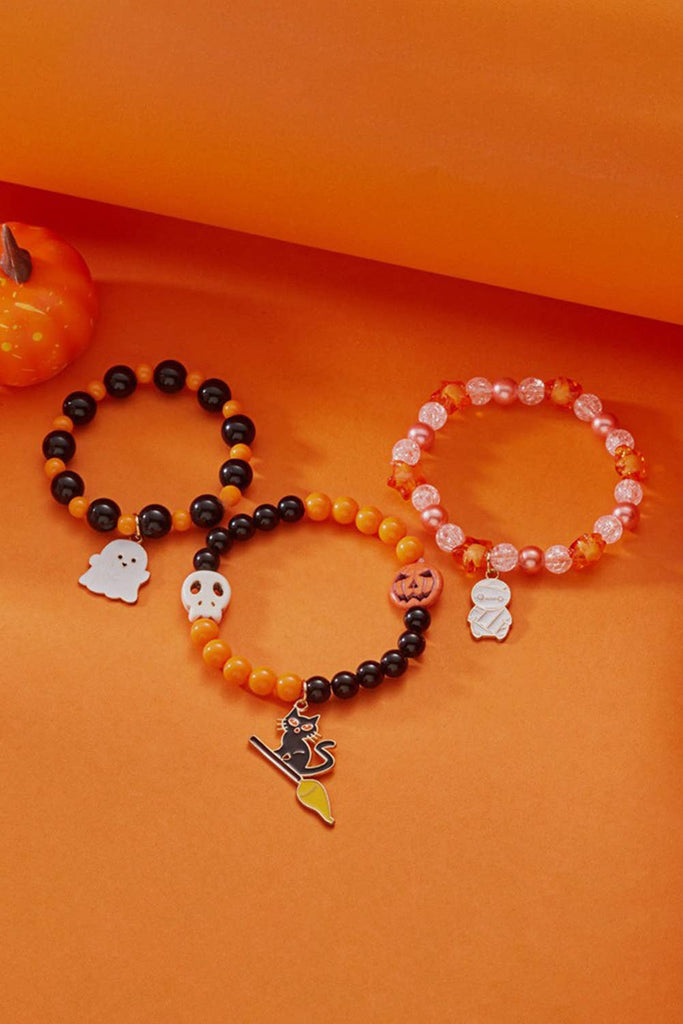 Celebrate Halloween with this crafted 3-piece stretch bracelet set featuring festive charms: pumpkins, a black cat with a broom, a mummy, and a ghost. Made from 100% bead stretch PMMA, these bracelets offer both durability and comfort for all-day wear. Perfect for adding a subtle yet spirited touch to your seasonal outfit or gifting to enthusiasts of the spooky season.