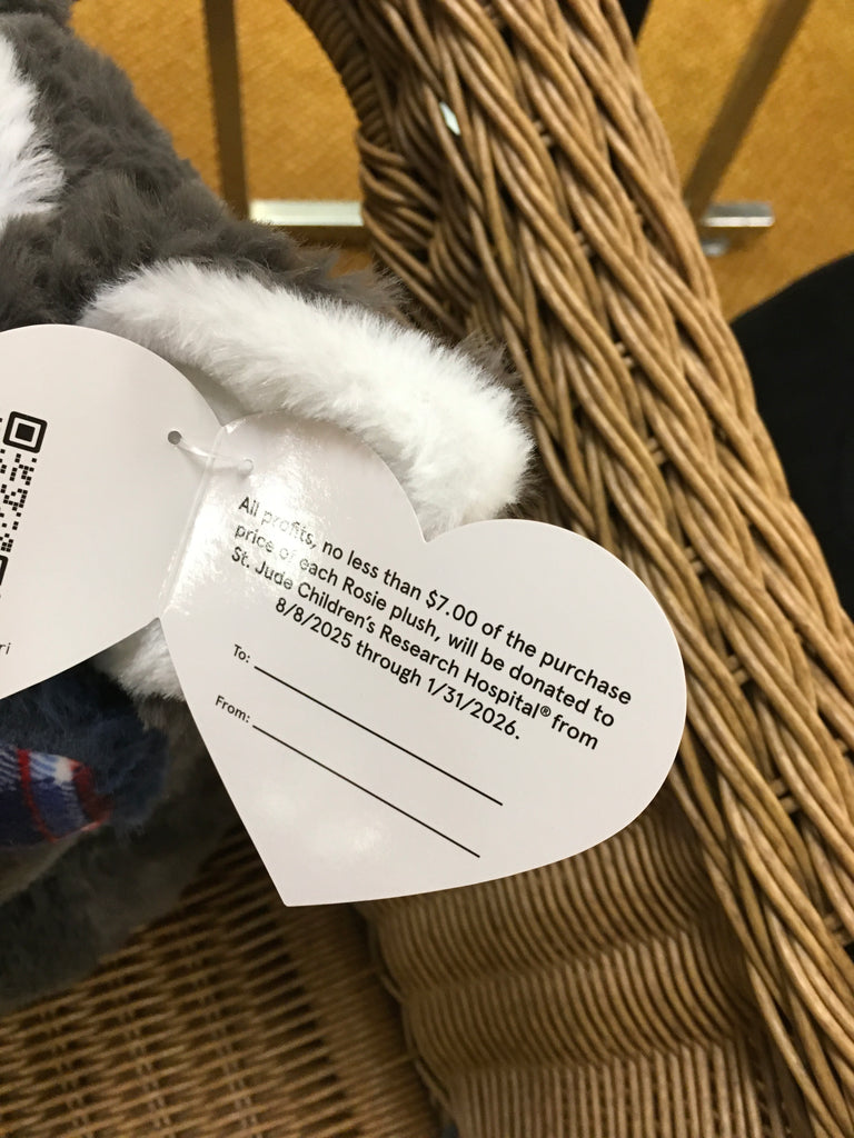 This 12” blue plush puppy named Rosie is the perfect gift for any animal lover, plush toy collector or to make a perfect cuddly, cozy friend gift. With a soft white color and brand new tags, it's sure to bring joy to its new owner. Plus, it supports a great cause - a portion of sales goes to St. Jude Children's Hospital. Perfect for children 3 years and up, this lovable toy is ready to find its forever home with you. 2025