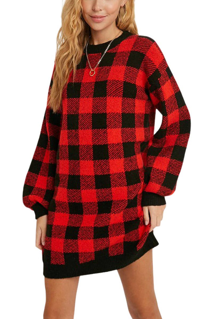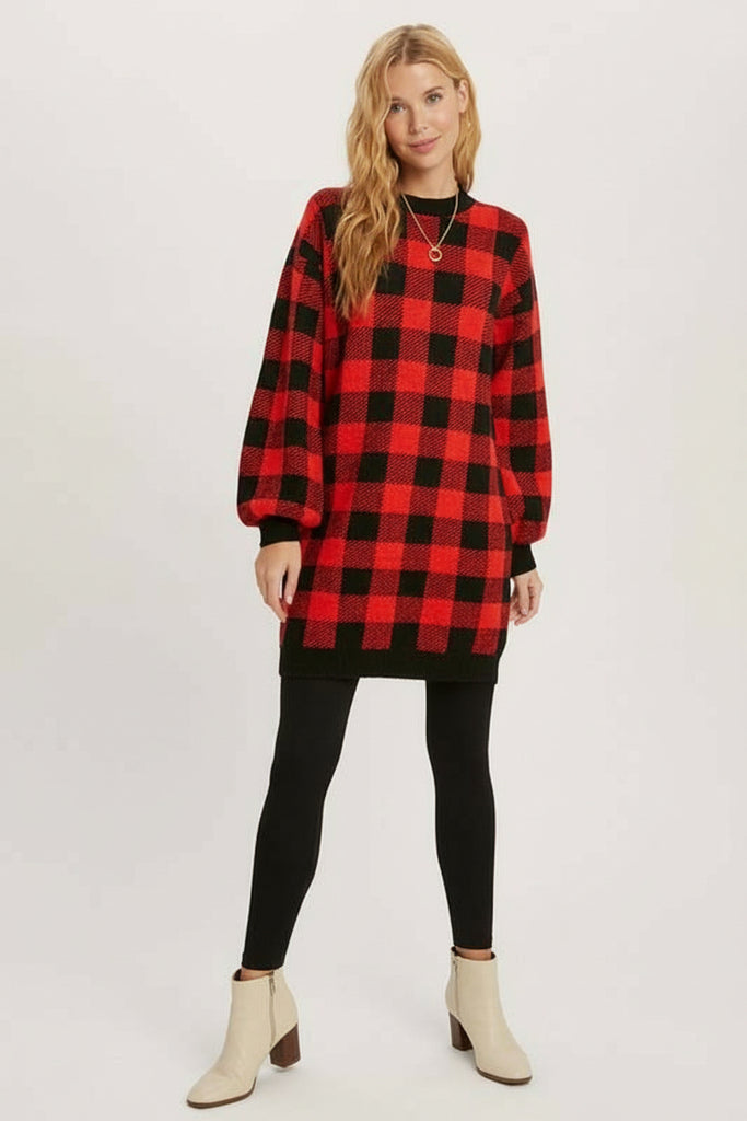 Embrace the season in this Buffalo Plaid Sweater Tunic Dress, where timeless plaid styling meets cozy comfort. Crafted from a substantial blend of acrylic, nylon, and spandex, this piece delivers exceptional warmth without sacrificing flexibility. The tunic silhouette offers versatile styling options—wear it solo or layered—making it an essential addition to your winter wardrobe. Perfect for those who want classic plaid appeal with modern comfort and durability.