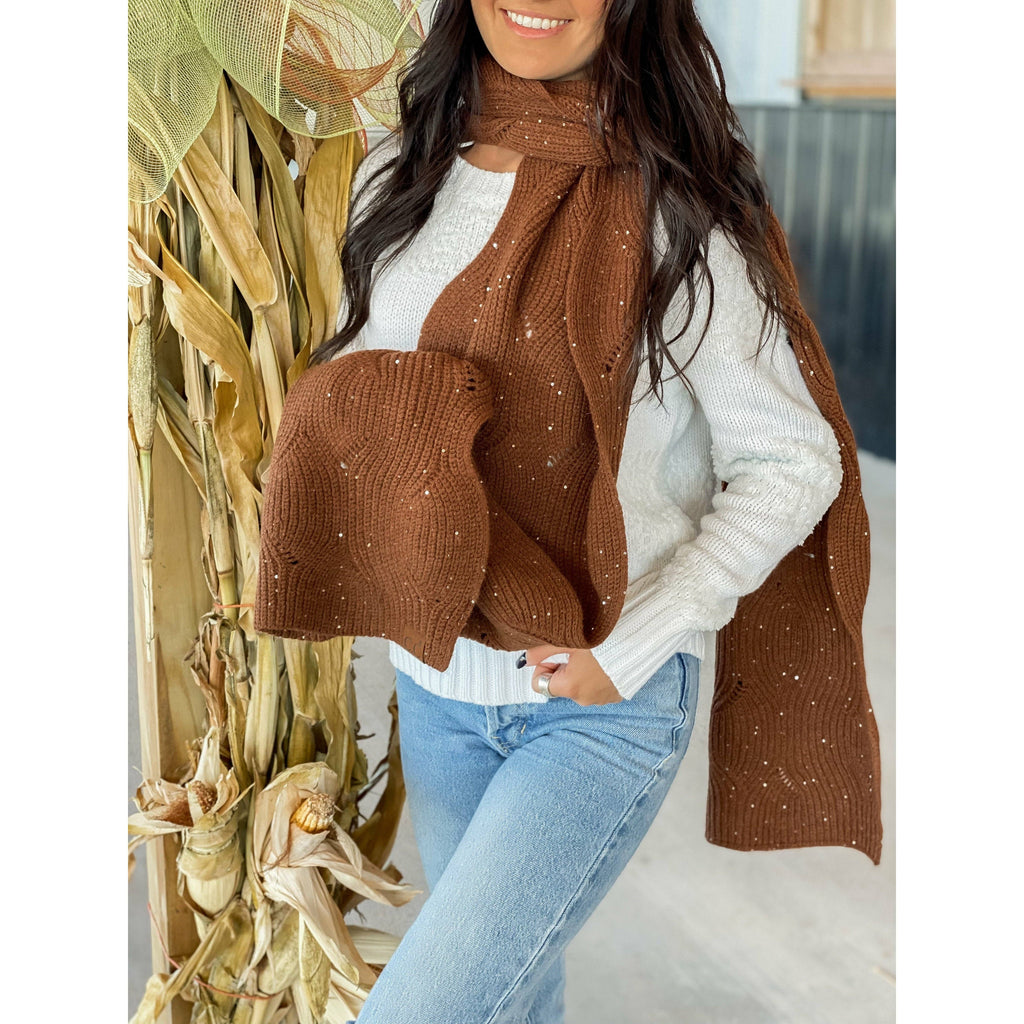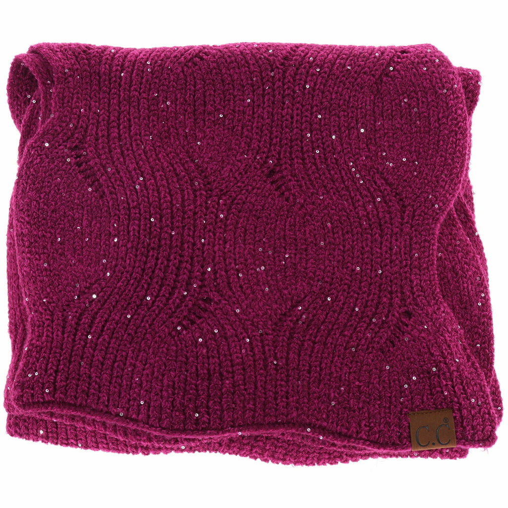 A scarf that sparkles!  It comes in Burgundy or Coffee and has scattered sequins throughout its intricate brioche cable knit pattern to catch people's eye!  This scarf compliments every outfit you have!  Measures: 86" in. L x 11" in. W